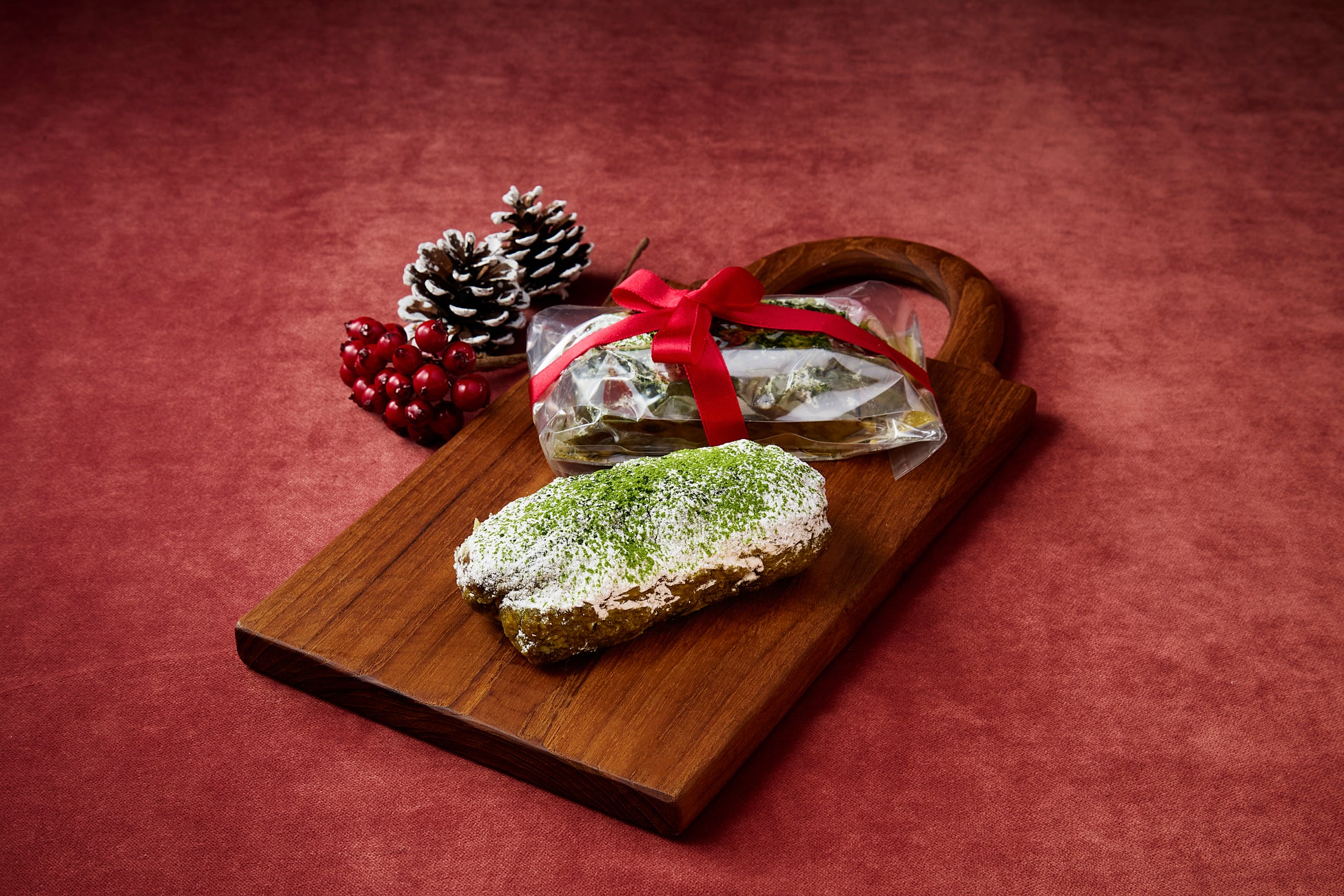 抹茶生地に洋酒香る果実とナッツを加え、焼き上げた後にバターと和三盆を染み込ませた、和の趣漂う今期初登場のシュトーレン。抹茶パウダーと粉糖の雪化粧が美しく、ワインや日本酒とも好相性です。