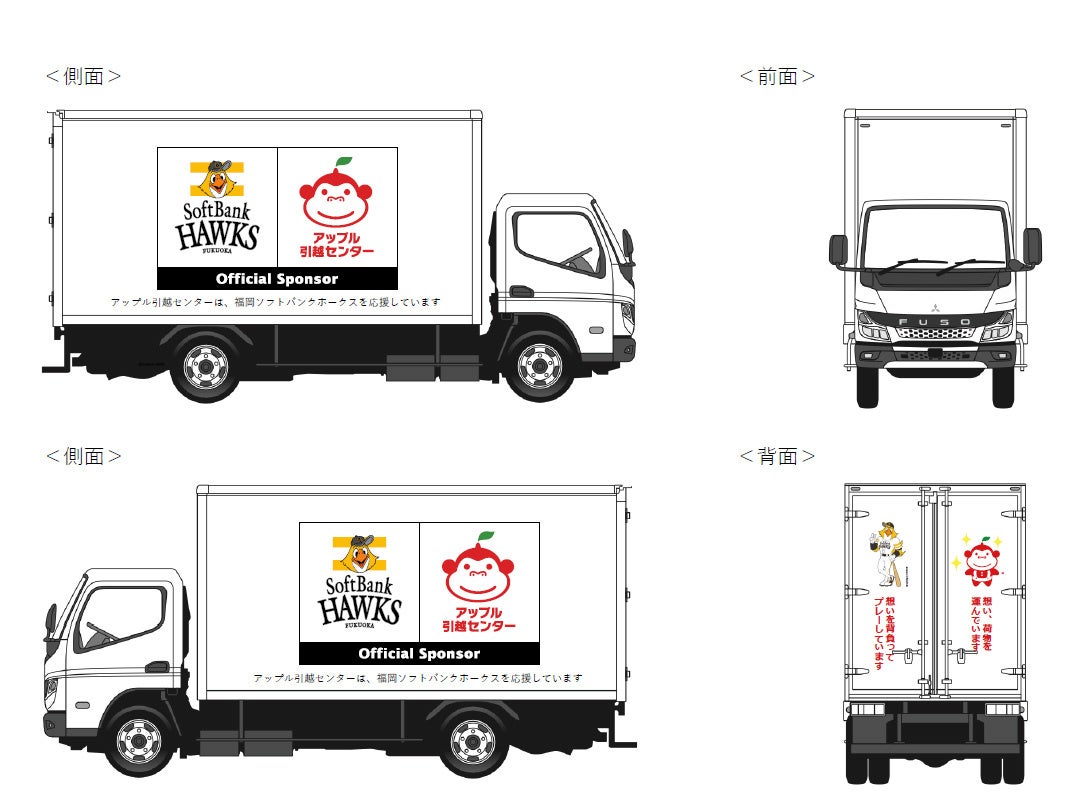 このトラックには、福岡ソフトバンクホークスの人気マスコット「ハリーホーク」と、アップルのオリジナルキャラクター「りんごりくん」がデザインされ、地域の皆さまのお引越しを元気にサポートいたします。