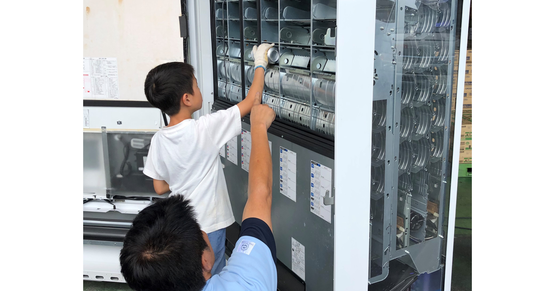 自動販売機への飲料補充体験、商品サンプル取り付け体験、認定式など