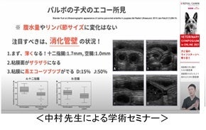 中村篤史先生(TRVA夜間救急動物医療センター 院長)による「幼若犬猫の救急医療」では、押さえておきたい幼・若齢期の救急疾患として、「新生子低血糖への対応」「感染症への対応」「誤食/腸閉塞への対応」「マズルコントロールによる陰圧性肺水腫への対応」を、時間的猶予がない中で、どのように治療すればいいか、実際の症例をもとに紹介しました。「感染症への対応」では、パルボウイルス感染症にフォーカスをあてて、子犬のエコー所見などを交えながら、診断方法から治療方法までを詳細に解説されました。