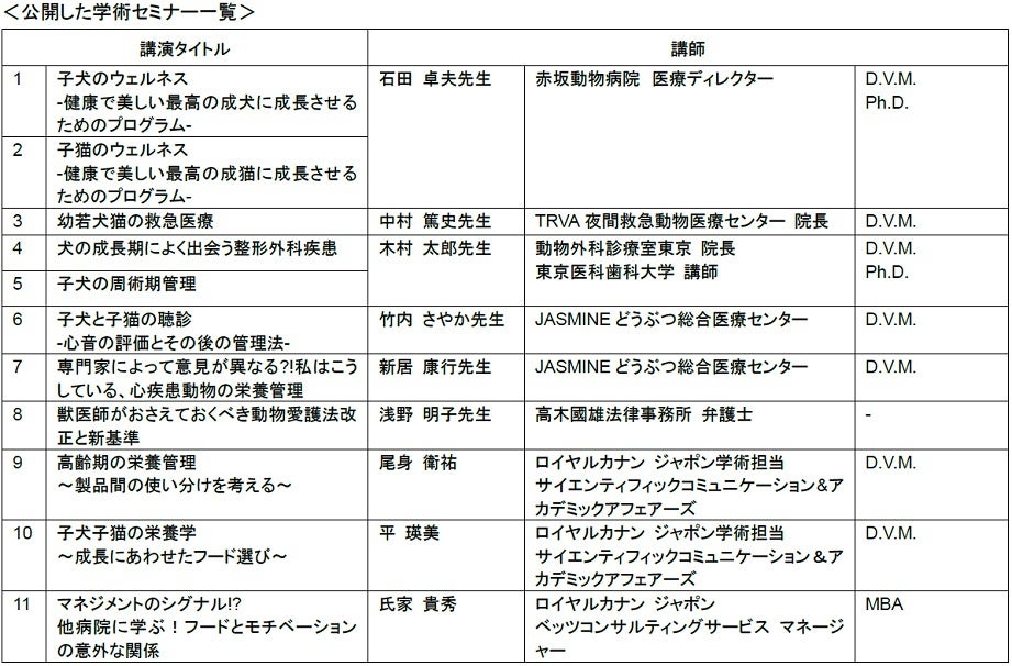 その他にも、木村太郎先生(動物外科診療室東京 院長、東京医科歯科大学 講師) による「犬の成長期によく出会う整形外科疾患」、「子犬の周術期管理」、竹内さやか先生(JASMINEどうぶつ総合医療センター獣医師) による「子犬と子猫の聴診-心音の評価とその後の管理法-」、新居康行先生(JASMINEどうぶつ総合医療センター)による「専門家によって意見が異なる?! 私はこうしている、心疾患動物の栄養管理」、浅野明子先生 (高木國雄法律事務所 弁護士)による「獣医師がおさえておくべき動物愛護法改正と新基準」など普段なかなか聞くことができない専門的な知見からの犬・猫の健康維持に関する講演をご提供しました。