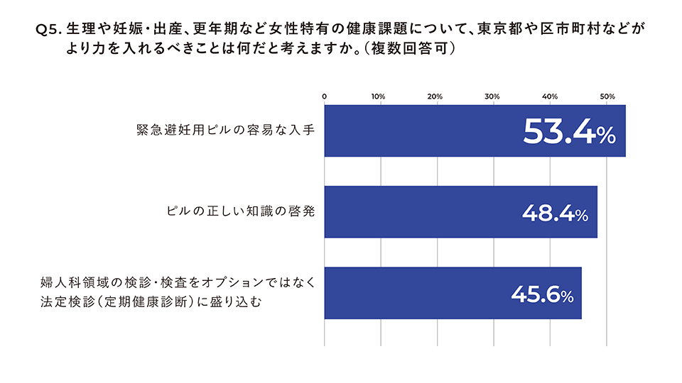 - 5割の女性が「緊急避妊用ピルの容易な入手」について東京都や市区町村がより力を入れるべきと回答
