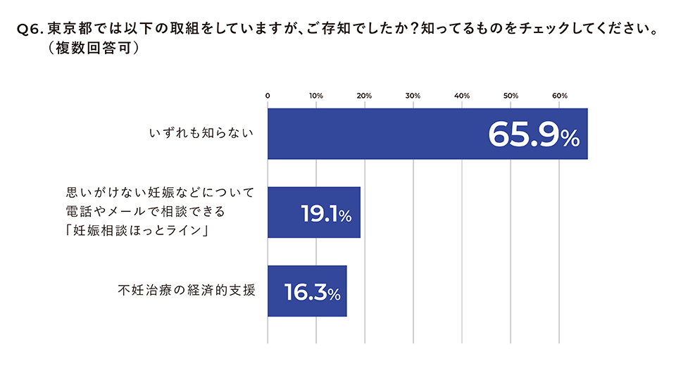 また、東京都が行っている女性特有の健康課題への取り組みに関しては、65.9%の方が「いずれも知らない」と回答する一方、思いがけない妊娠などについて電話やメールで相談できる「妊娠相談ほっとライン」は約2割の方が知っていることから、本当に困った際に頼れるインフラのニーズは高いことが伺えます。