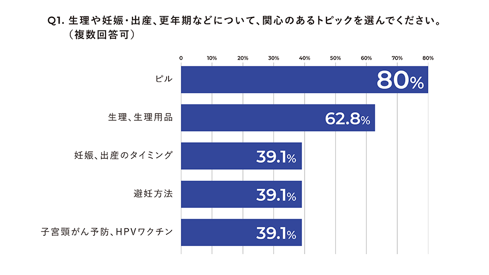 「ピル」に次いで関心が高かったのは「生理・生理用品(62.8%)」で、吸水ショーツや月経カップなど“第3の生理用品”が話題になっていることも少なからず影響しているようです。また、妊娠・避妊関連のテーマ以外でも、「子宮頸がん予防、HPVワクチン(39.1%)」「性感染症(37.2%)」「セクシュアル・リプロダクティブ・ヘルスアンドライツ(18.8%)」「更年期障害(18.4%)」といった回答も得られました。