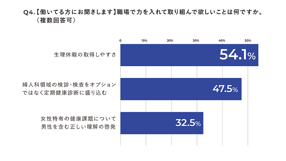 - 職場で力を入れて取り組んで欲しいこと1位は「生理休暇の取得しやすさ」