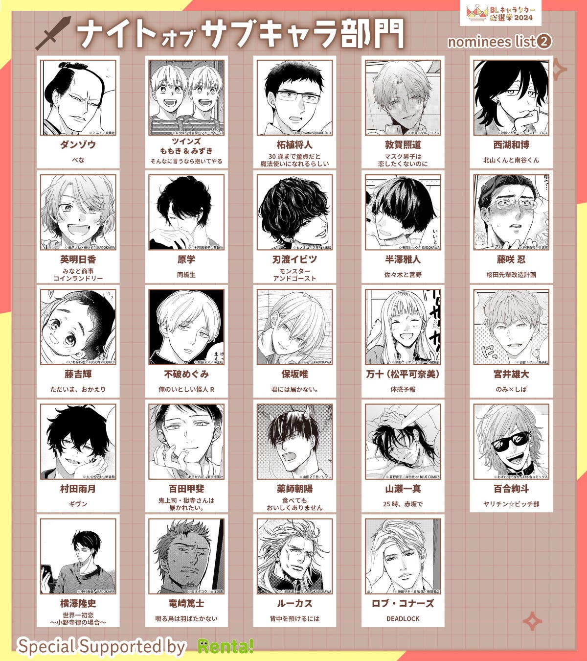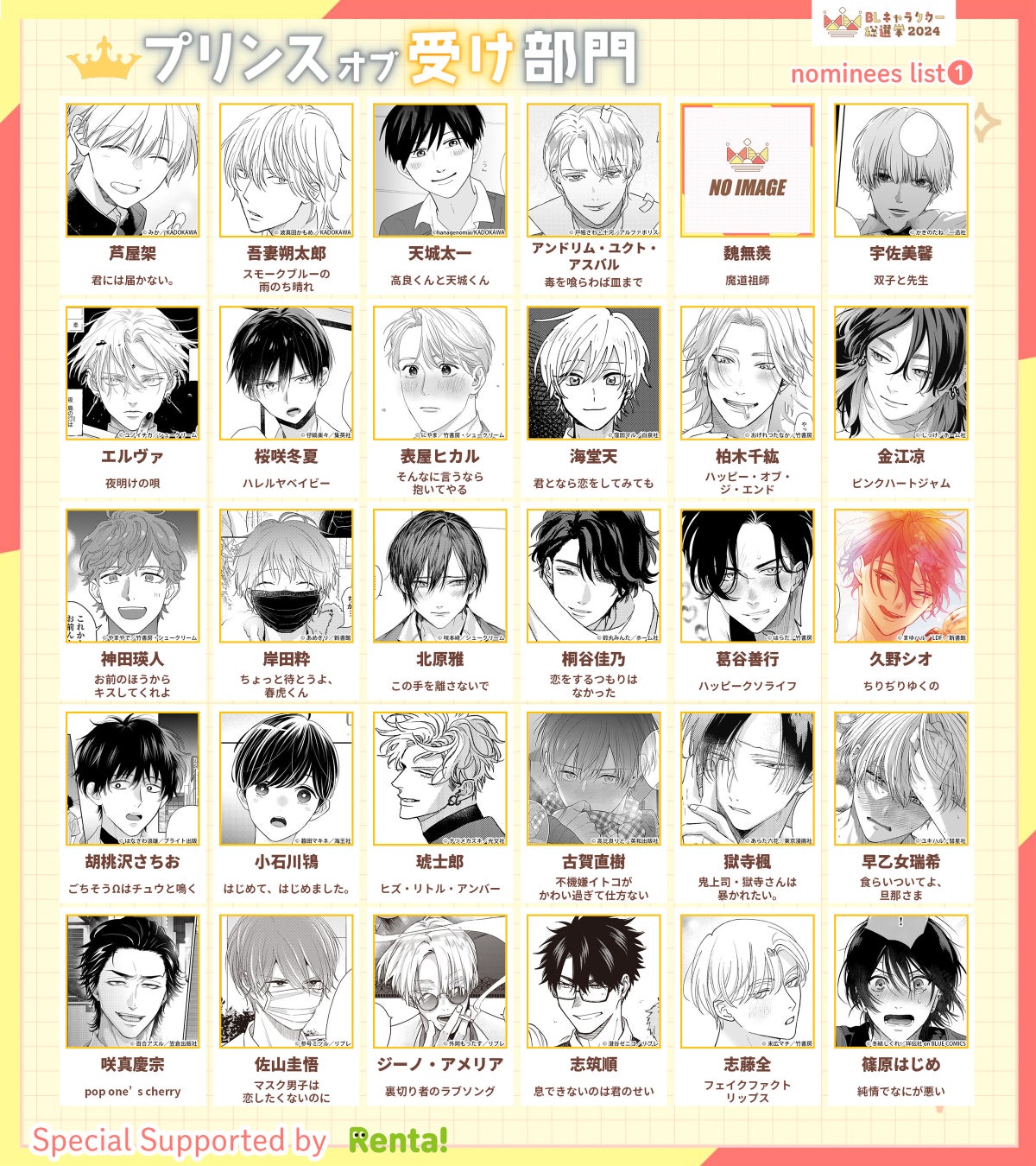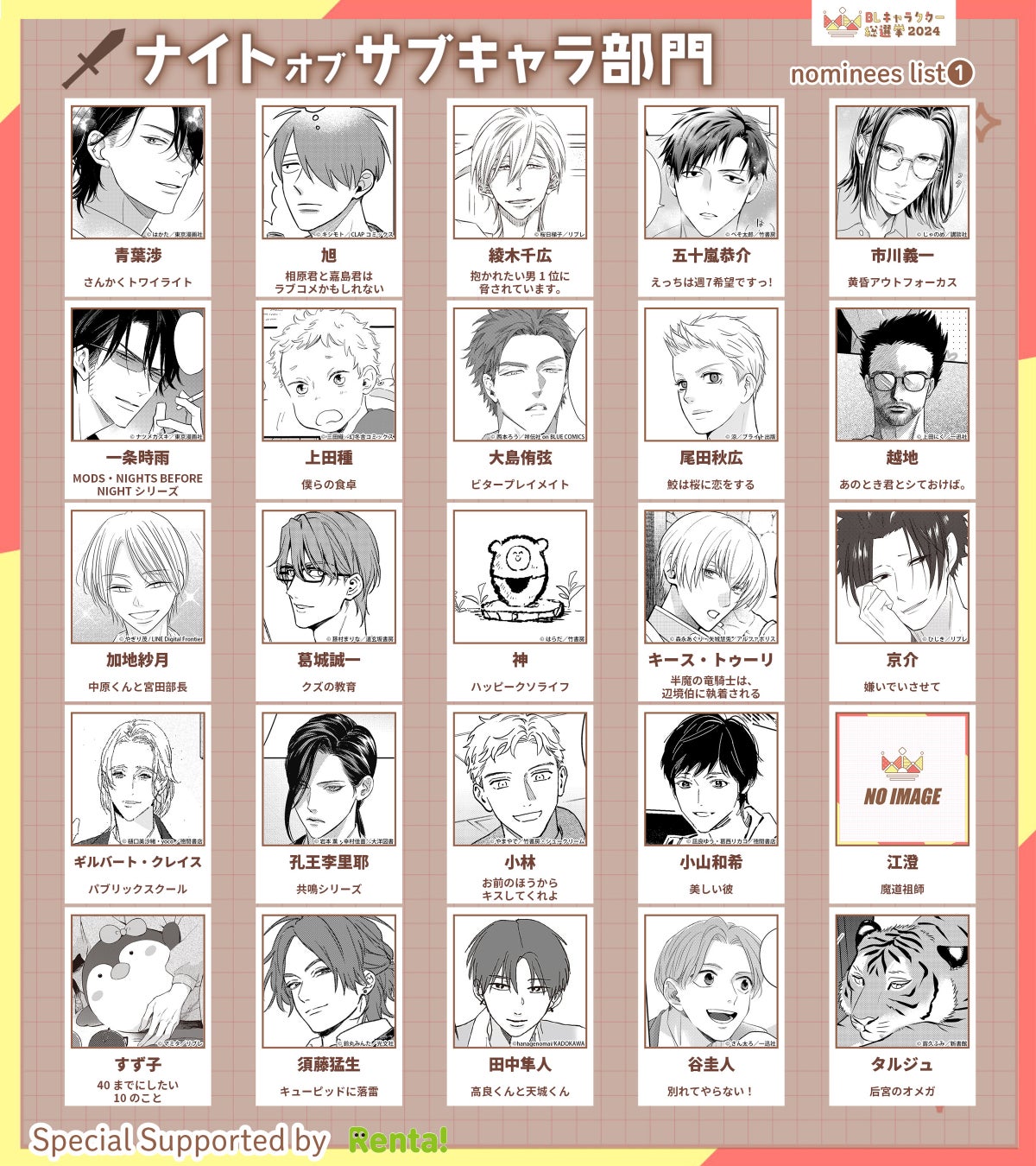 投票対象:2024年3月31日までに紙書籍が発売された商業BL作品(漫画・小説)に登場するキャラクターから事前のノミネート募集などの結果により選出されたノミネートキャラクター