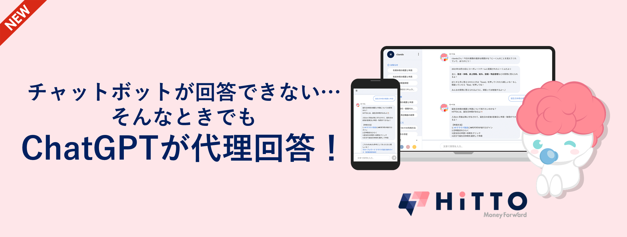 「HiTTO」は、バックオフィス部門を中心にご採用いただいている、AIチャットボットです。人事・労務・総務やITシステムなどに定型的な質問をご担当者様の代わりにチャットボットが対応することで、対応工数の削減に貢献いたします。