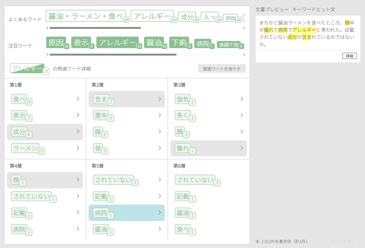 特許技術によって作成したグループを更に細分化することで、顧客の声を細かく分析することが可能です。