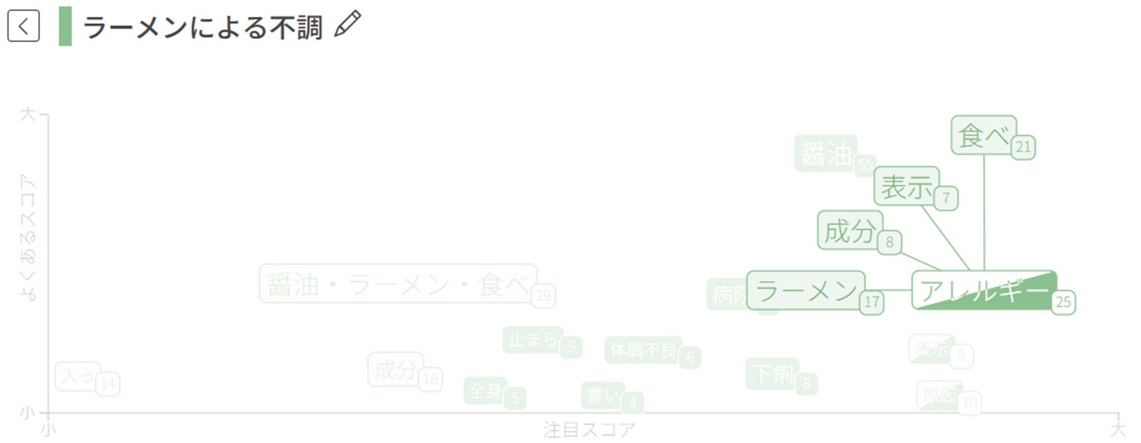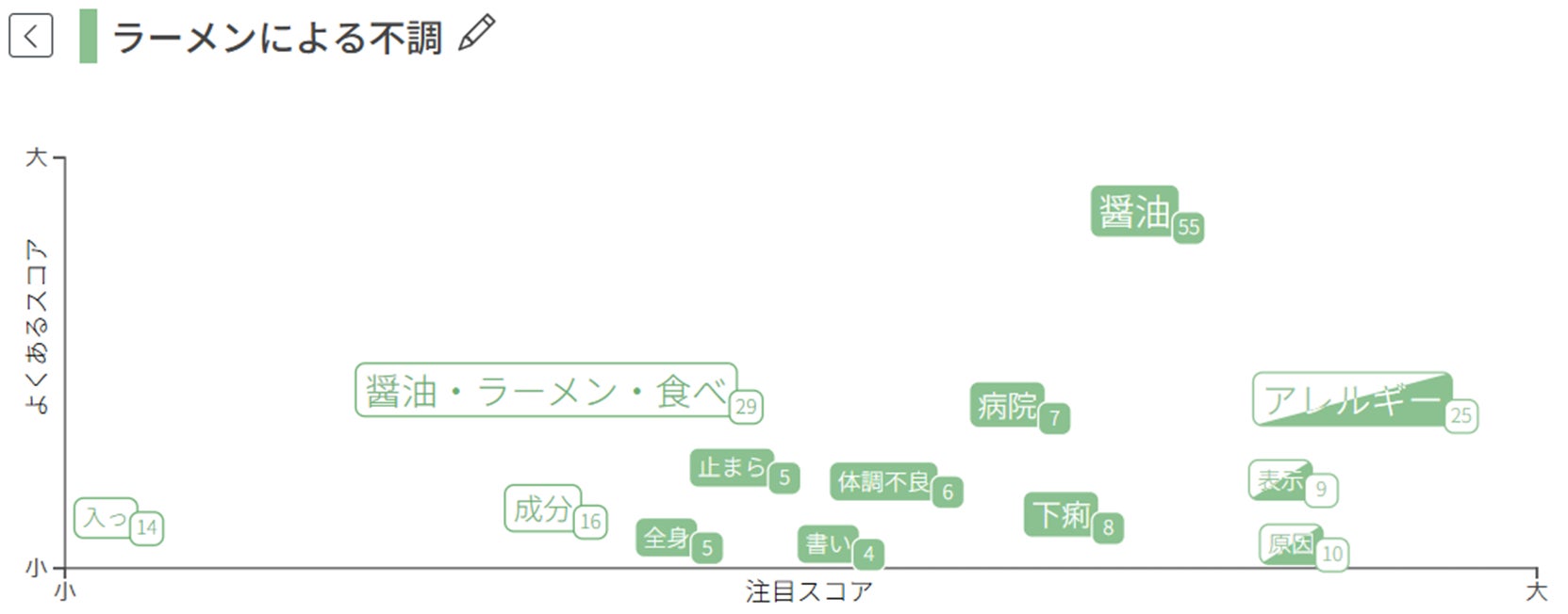 (2)出現頻度と注目度を縦横の軸とした2次元ワードマップ上に単語をプロットして可視化 ※図1