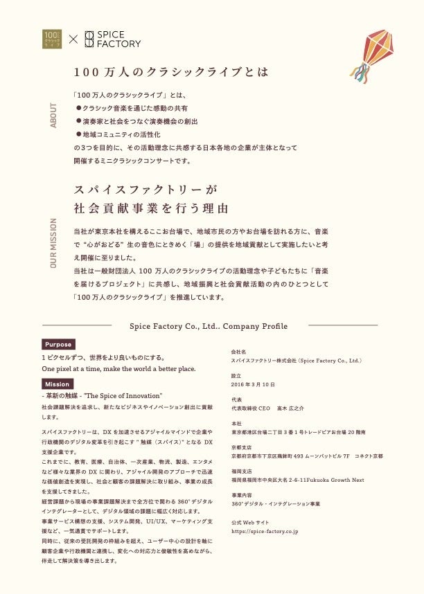 デジタル・トランスフォーメーションを⽀援するスパイスファクトリー株式会社(本社:東京都港区、代表取締役CEO:高木 広之介)は一般財団法人100万人のクラシックライブ(所在地:東京都千代田区、代表理事:蓑田 秀策)の活動理念に共感し、この活動を支援しております。