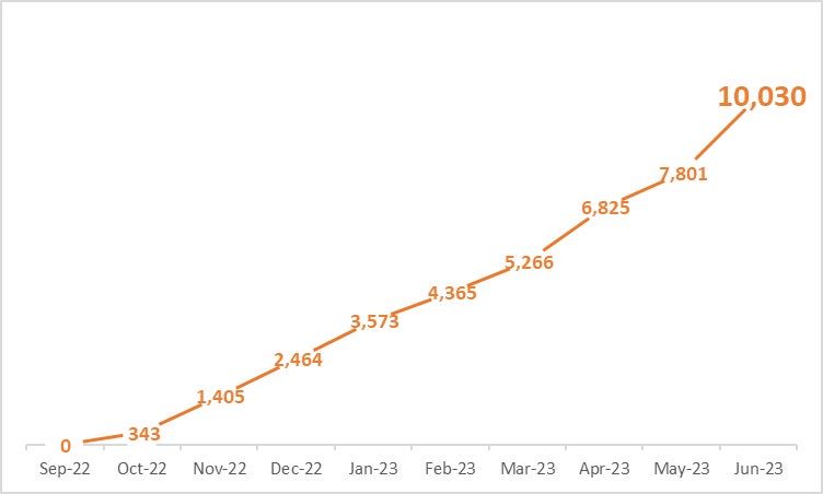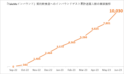 2022年9月よりサービス再開をした「TakeMeインバウンド」の契約飲食店へのインバウンドゲスト送客数は順調に伸び、3月の桜のシーズンには5,000人を超え、その後6月末に10,000人を突破しました。