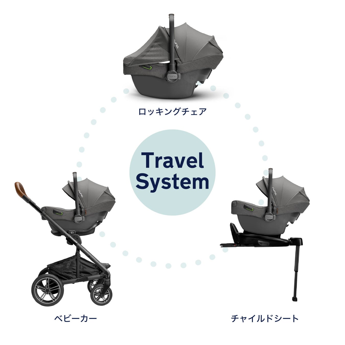 「トラベルシステム」とはお子さまを乗せるベビーシートを使い、お家・お車・ベビーカーへのご移動をスムーズにする機能。
