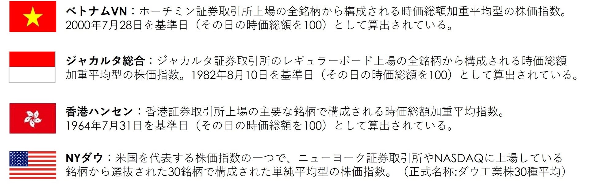 ベトナムVN、ジャカルタ総合、香港ハンセン、NYダウ |