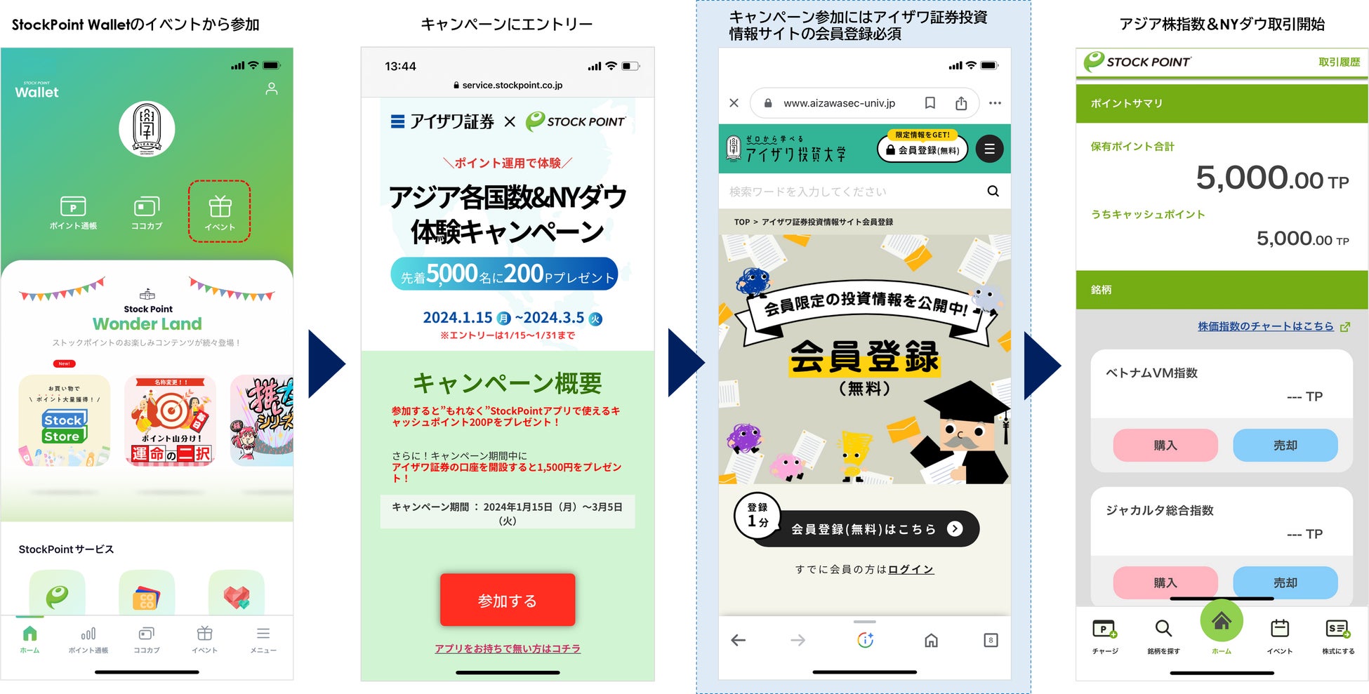 アイザワ証券株式会社(本社:東京都港区、代表取締役社長:藍澤卓弥、 以下、「アイザワ証券」)と、STOCK POINT 株式会社(本社:東京都港区、代表取締役社長:土屋清美、以下、「STOCK POINT」)は、アイザワ証券が提供するアジア各国の株式取引をより多くの方に体験していただくため、投資家の関心が高いベトナムVN、ジャカルタ総合、香港ハンセンと米国株指数のNYダウを、ポイント運用で体験するキャンペーンを実施いたします。期間は2024年1月15日(月)~3月5日(火)となり、参加条件を満たす先着5,000名様に、キャンペーン内で使える5,000ポイントを進呈します。