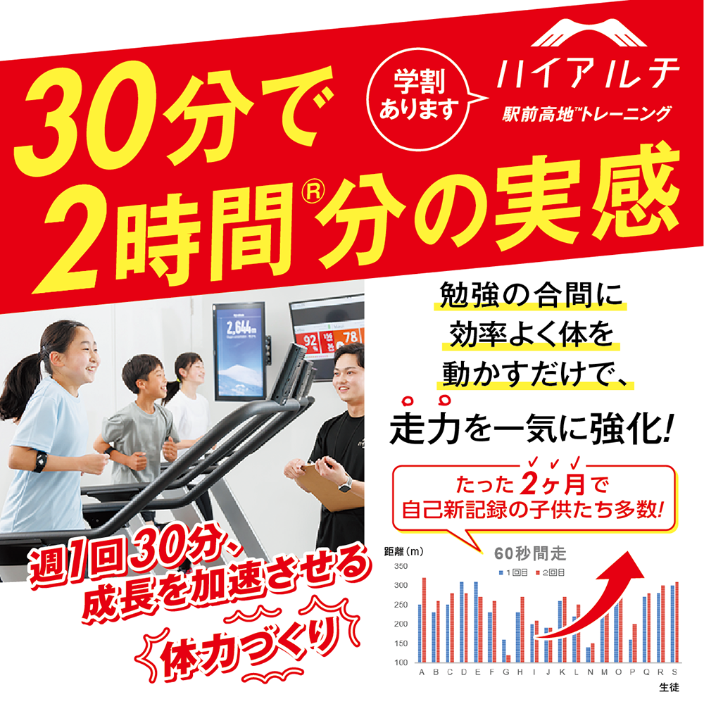 低酸素トレーニングの最先端、日本初*の高地トレーニング専門スタジオ「ハイアルチ」が開発した、小学生専用の「ハイアルチ塾」は、標高2,500m相当の低酸素ルームで、週1回50分の短時間トレーニングを行い、走力・心肺機能・体幹・俊敏性を総合的に高めます。