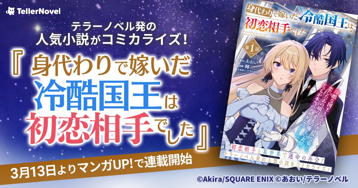 株式会社テラーノベル(本社:東京都港区、代表取締役社長:蜂谷宣人)はこの度、累計DL数760万(※)の小説共有プラットフォーム「テラーノベル( https://teller.jp/ )」発の人気小説『身代わりで嫁いだ冷酷国王は初恋相手でした』がコミカライズされ、「マンガUP!」( https://www.manga-up.com/ )にて連載を開始することをお知らせいたします。