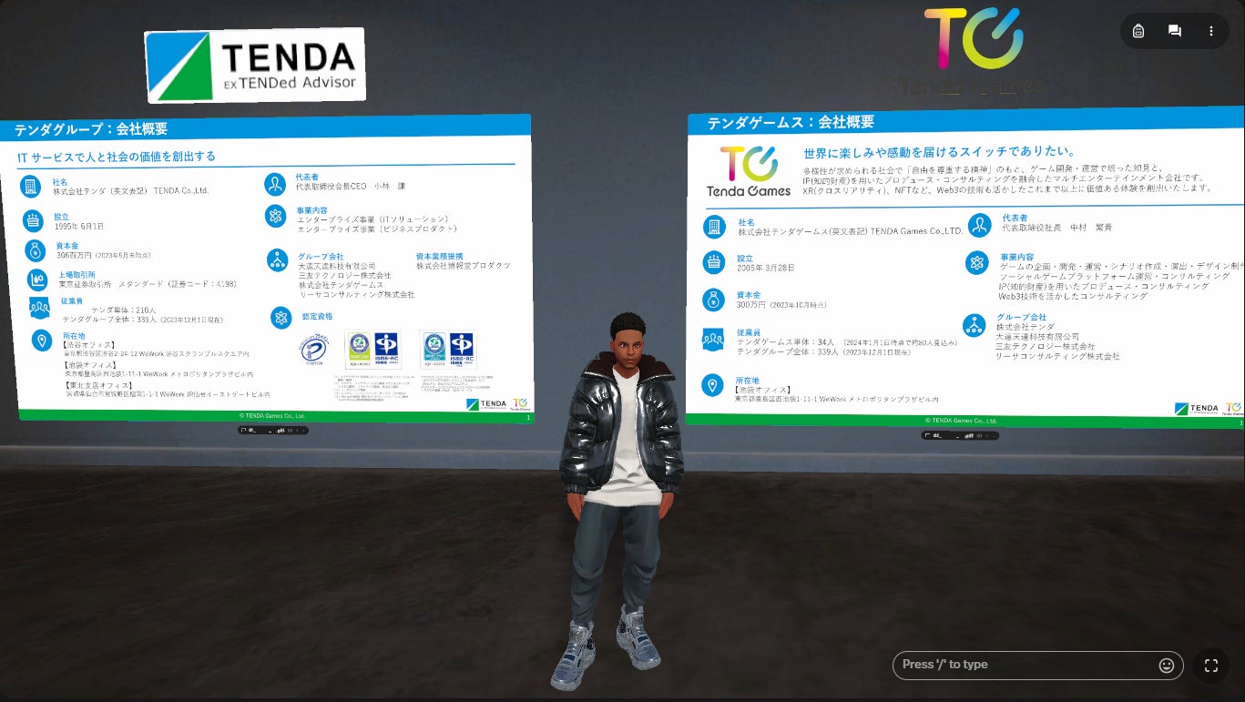 「ゲームスラボ」メンバーが構築した「TENDA LAND」では、テンダおよびテンダゲームスの会社情報および事業内容をご覧いただける展示スペースとなっています。ぜひご覧ください。