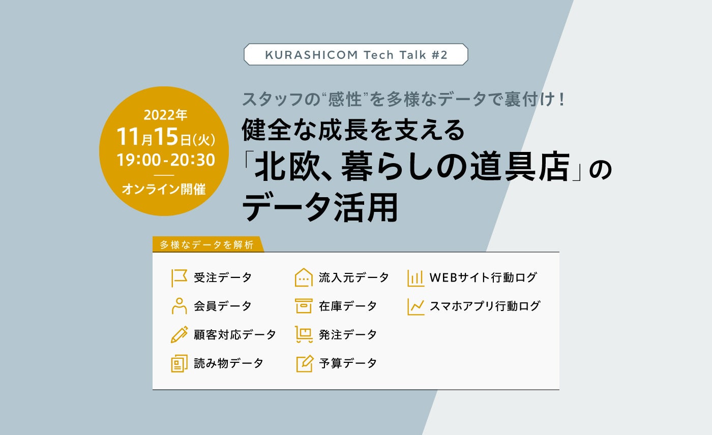 クラシコムのデータ分析チームのさまざまな施策や試行錯誤をお話するトークイベント[Kurashicom Tech Talk 健全な成長を支える「北欧、暮らしの道具店」のデータ活用]を11月15日(火)に開催します。