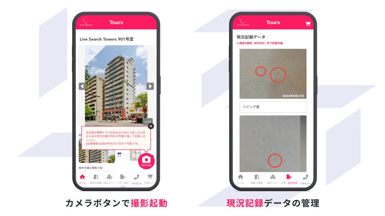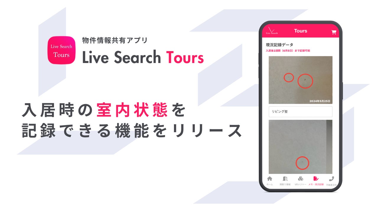 不動産会社向け物件写真・間取り図DXサービスを展開する株式会社Live Search(本社:福岡県福岡市中央区、代表取締役:福井 隆太郎/以下、「リブ・サーチ」)は、無料提供サービス「Tours」で入居時の室内状態を記録できる機能を開発したことを発表いたします。これにより、入居者は入居直後の室内情報を記録・保存でき、原状回復・敷金精算時のトラブル解消に活用できます。