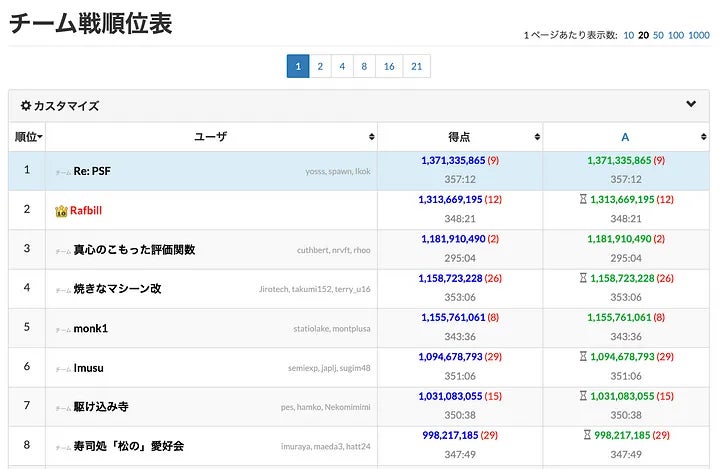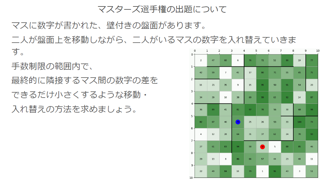 ※競技内容は大きく2種類あり、一つは主に「計算に非常に時間のかかる問題に対して一瞬で解を出せる計算量の良いアルゴリズム」を考案・実装する力が問われる部門、もう一つは「最良の解を求めることが困難な問題に対してできるだけ良い解を与えるアルゴリズム」を考案・実装する力が問われる部門です。このうち後者のものは「マラソン型」コンテストと呼ばれています。
