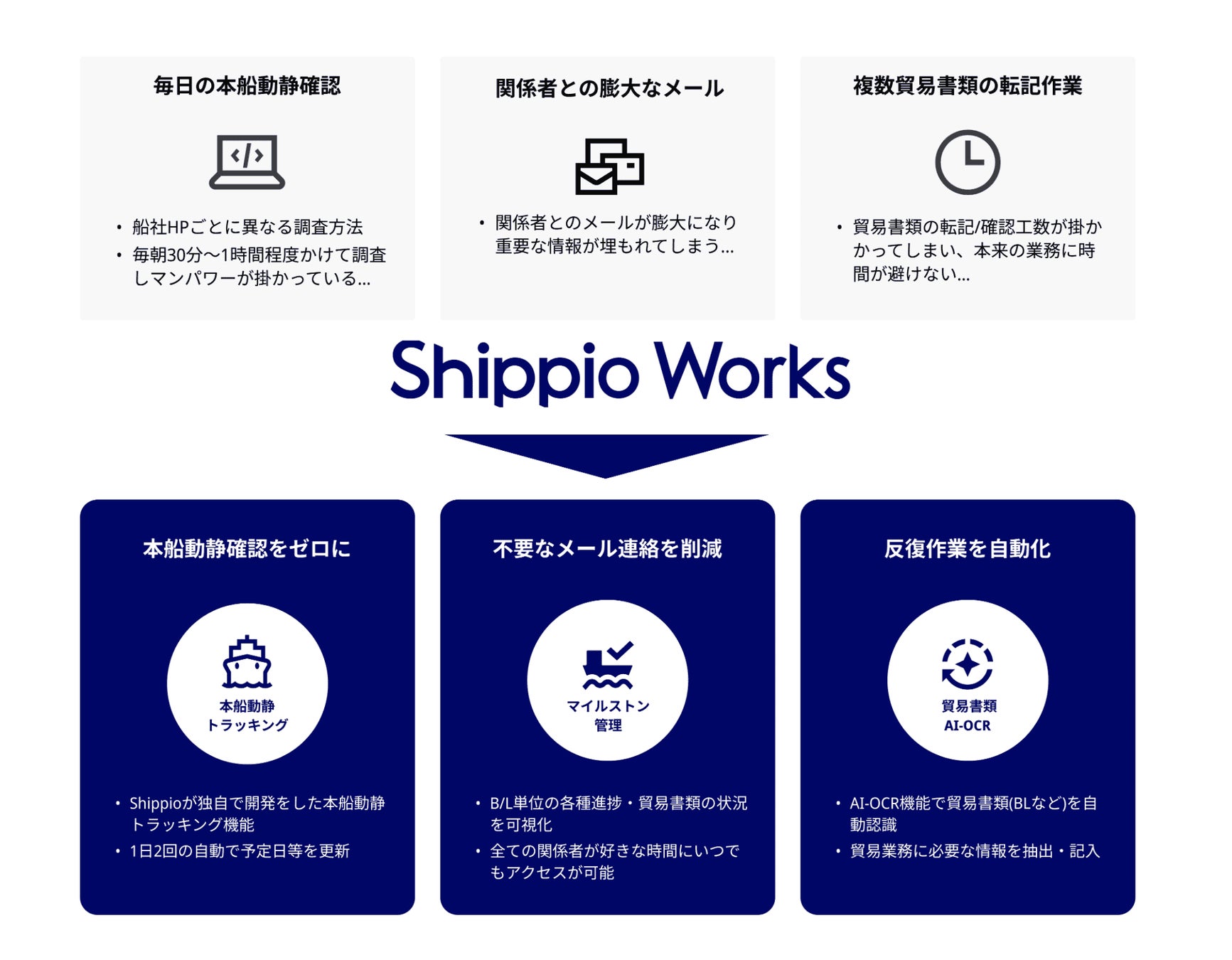 Shippioは多くの企業が汎用的に活用できるコミュニケーションプラットフォームとして「Shippio Works」を提供し、国際物流事業に関わる方々の業務負荷を軽減、属人化を解消することで、業務の標準化とオペレーション品質の向上を実現いたします。
