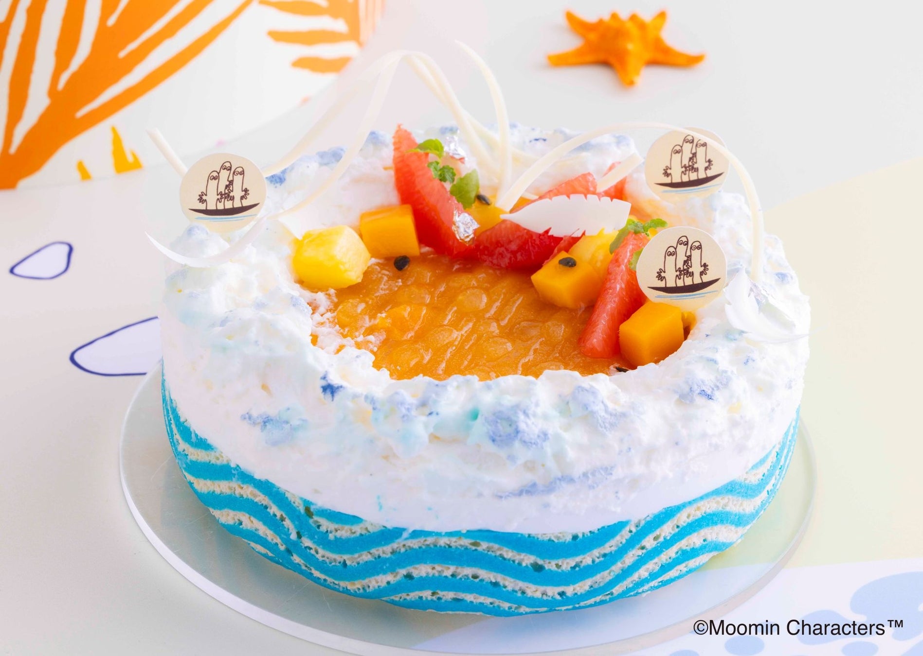 ムーミンママが、テーブルにドリンクをこぼしてしまい、恥ずかしさのあまりパラソルの下にみんなで隠れながら食事をした一幕を再現。愛らしいムーミン一家のおしりが並んだホールケーキには、グアバやピーチコンポートなどを使い、夏らしい爽やかなフレーバーを楽しめます。