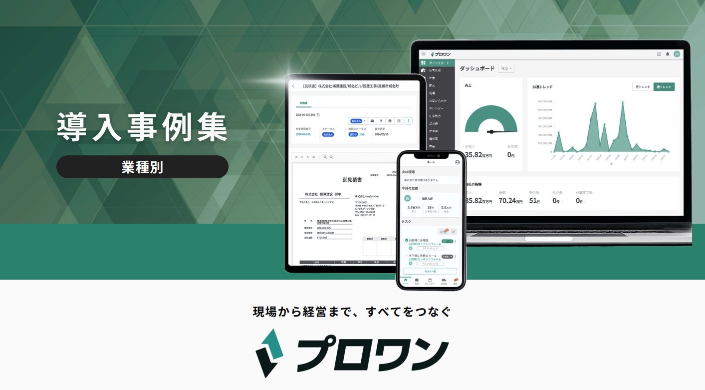 株式会社ミツモア(本社:東京都中央区、代表取締役:石川彩子)が提供する営業・現場・経営をつなぐ一気通貫の業務管理システム『プロワン』は、導入企業の活用事例をまとめた「業界別導入事例集」を公開しました。