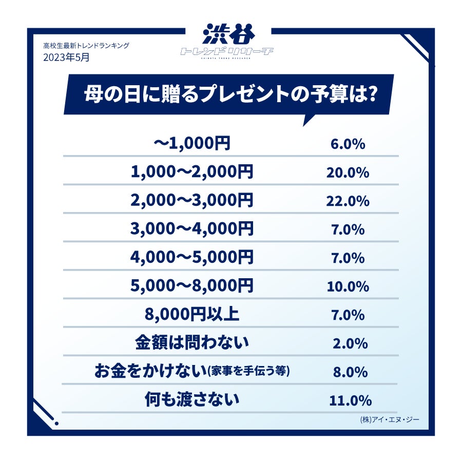 「2,000〜3,000円」が最も多く選ばれた金額帯でした。毎年、カーネーションと手紙をセットでプレゼントしているというコメントも寄せられ、母の日に花を贈る文化は現在でも大切にされていることがわかります。また、「5,000~8,000円」を選んだ高校生からは、ブランドの財布や美顔器など高額なプレゼントを贈るといった声も見られ、母の日を誕生日と同様に特別な日と位置付けている人も少なくないようです。
