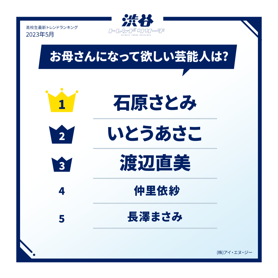 弊社が昨年に公開した「高校生が選ぶお母さんになって欲しい芸能人ランキング2022」に続き、「石原さとみ」さんが1位を獲得。「子どもの気持ちに寄り添ってくれそう」「友達感覚で話せそう」「一緒に出かけてくれそう」と言ったコメントが散見され、高校生が母親に求める理想像があらわになりました。2位には「いとうあさこ」さん、3位には「渡辺直美」さんがランクイン。「笑いが絶えない楽しい毎日を送れそう」と言った声もあり、俳優陣が上位を占めた昨年の同調査との違いも見られました。