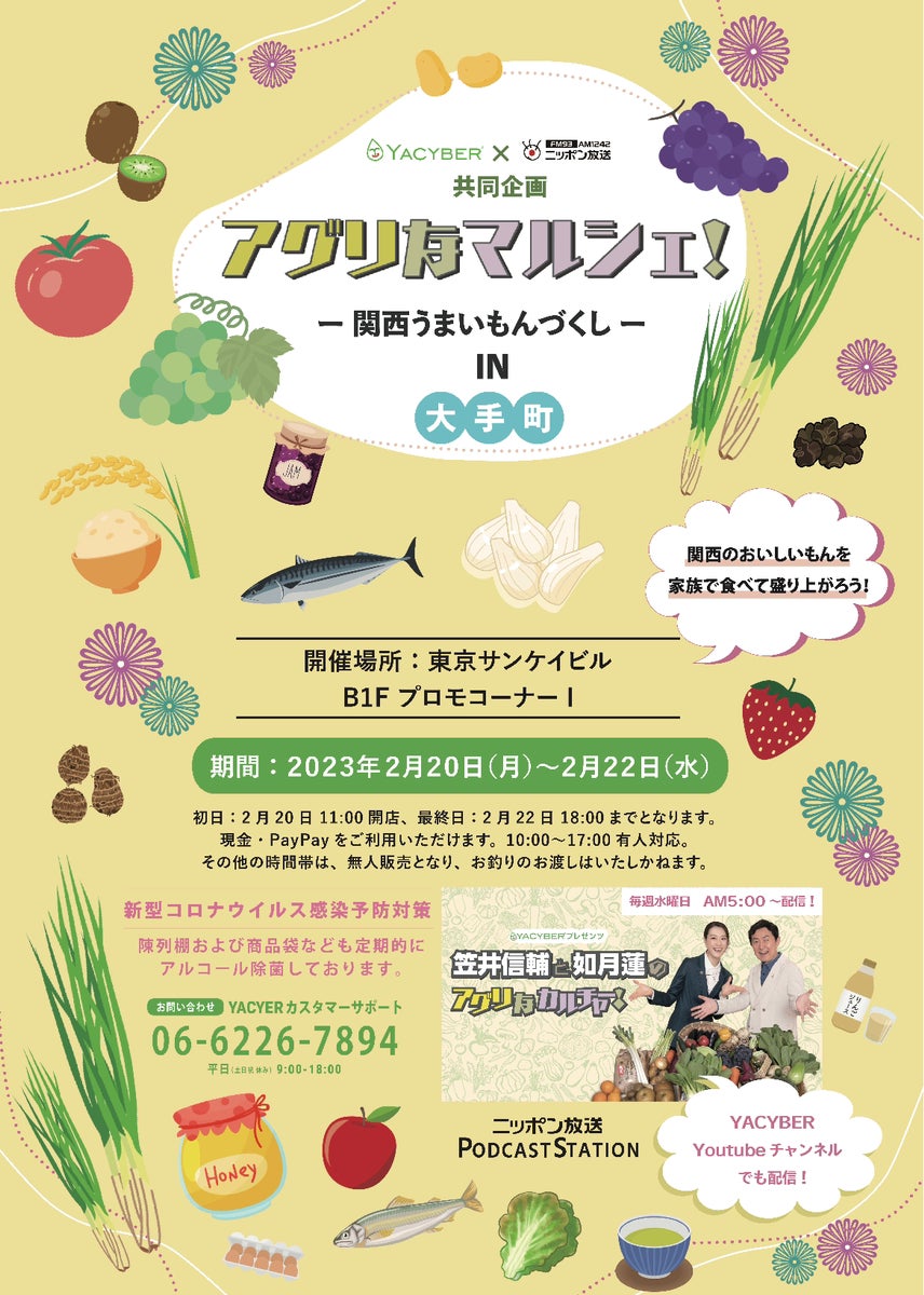 YACYBER株式会社(所在地:⼤阪府⼤阪市、代表取締役社⻑:唐澤太郎)は、ニッポン放送ポッドキャストステーションにて配信中の『YACYBERプレゼンツ 笠井信輔と如月蓮のアグリなカルチャー!』(毎週水曜 AM5:00)番組と連動し、東京都千代田区の東京サンケイビル B1F プロモコーナー Iにて、2月20日(月)〜22日(水)限定で『アグリなマルシェ! - 関西うまいもんづくし - IN 大手町』を出店いたします。
