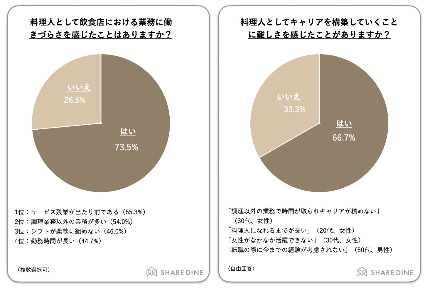 シェアダインでは、飲食店勤務経験のある料理人を対象としたアンケート調査「働き方やキャリア構築に関するアンケート」を実施しました*。その結果、料理人の約7割が「飲食店での業務における働きづらさを感じる」と回答し、キャリア構築に難しさを感じていることが明らかになりました。