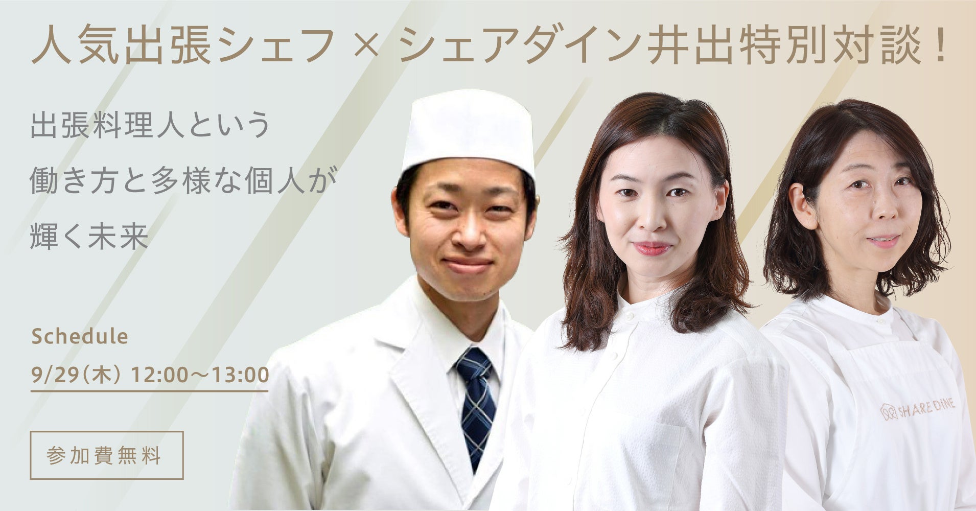 シェアダインで活躍中の人気シェフと、シェアダインの共同代表である井出が、早くから料理人としての経験を積むことができる「出張シェフ」という働き方や、料理人の働き方の未来について対談します。出張シェフの魅力とは?子育てしながら働けるか?実際どれくらい稼いでいる?など、気になる出張シェフの働き方について、井出が人気シェフにお伺いします。