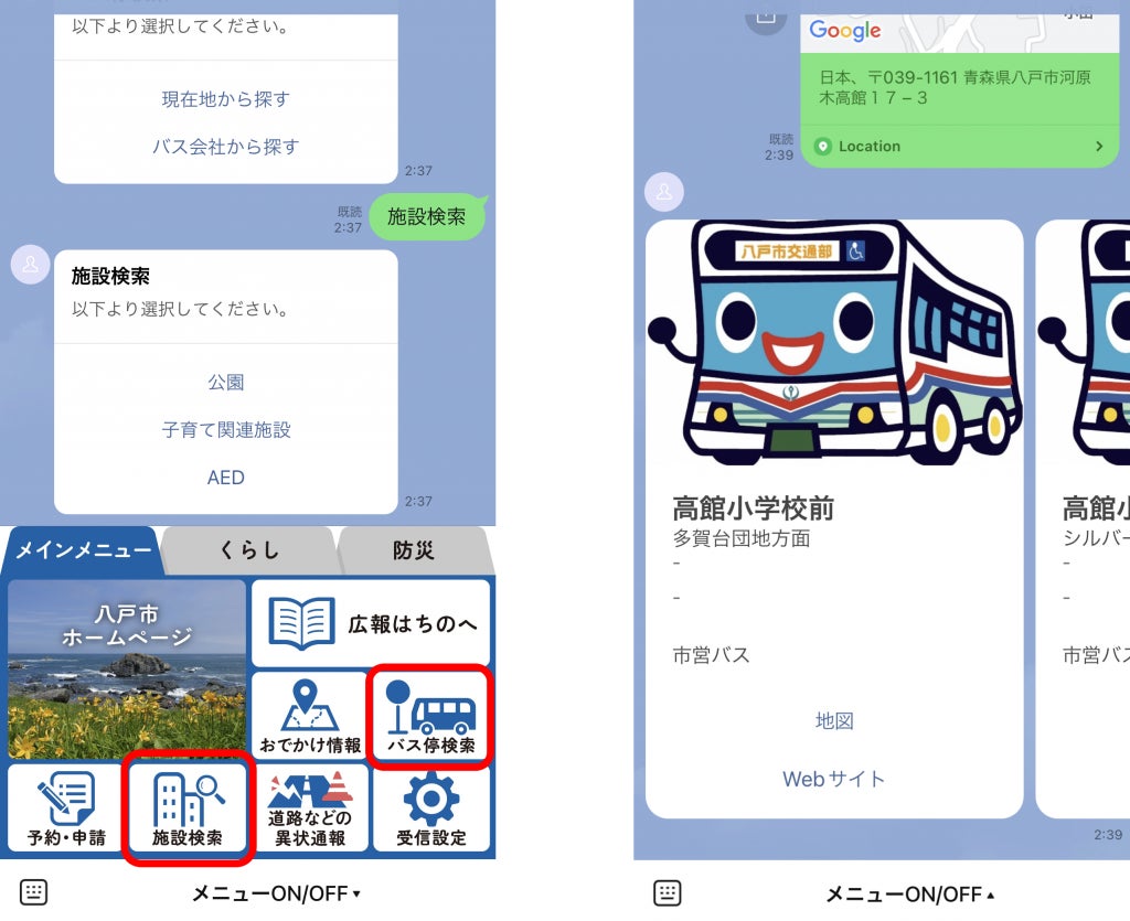 子育て関連や公共施設、バス停などの情報を検索できる「スポット検索機能」
