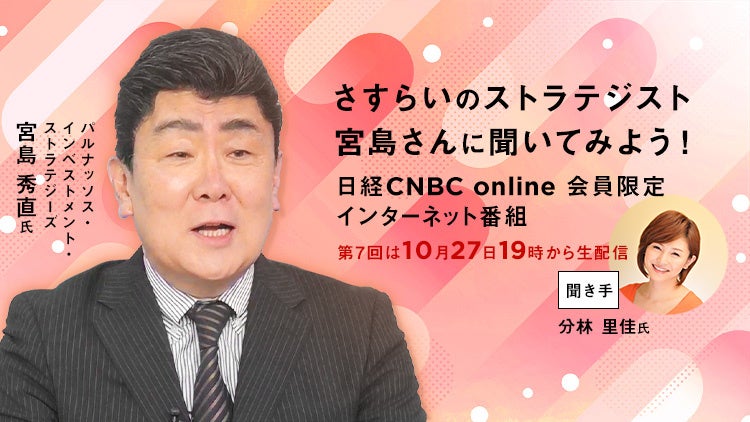 10⽉27⽇(金)は19時から⽇経CNBC onlineの会員に向けて、同日14時に放送する「昼エクスプレス『さすらいのストラテジスト 宮島が斬る!』」では語り切れなかったことをじっくり解説するほか、みなさんから寄せられた質問に時間が許す限りお答えします。