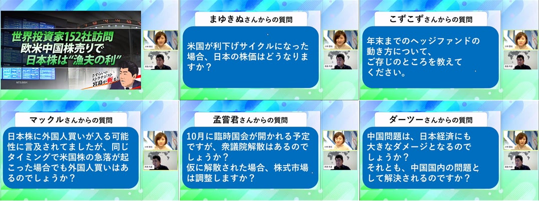 ・海外勢の動向から宮島さんご自身に関することまで、様々な質問にお答えいただく日経CNBCのインターネット限定番組です。(下の画像は10/5配信の第6回のものです)