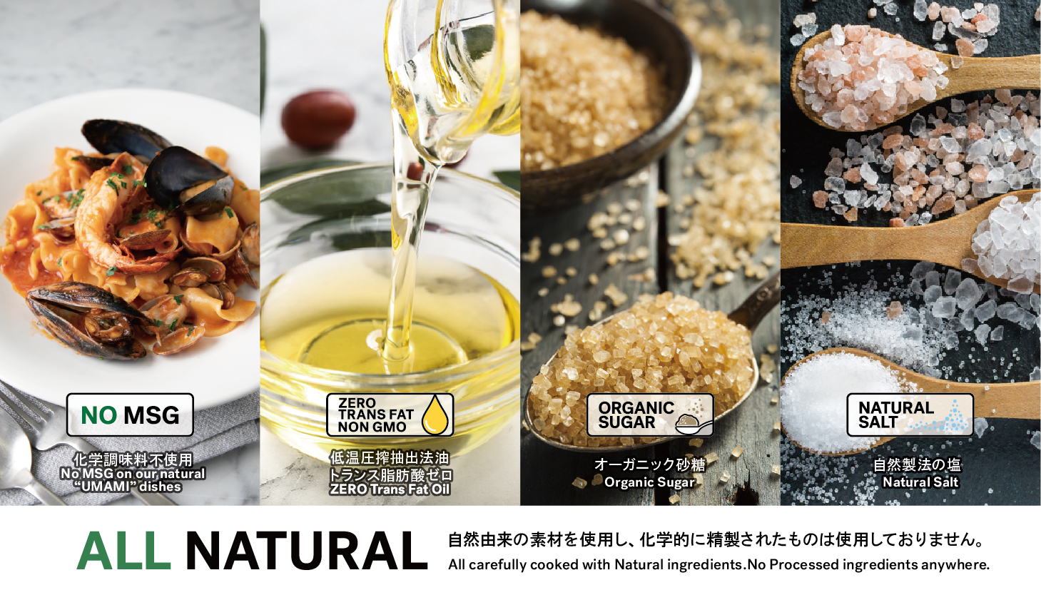 可能な限りすべての料理に対して自然由来の素材を使用し化学的に精製されたものを使用しない”ことを目指してきたからこそ、小さなお子様からどの年代の方にも安心して召し上がって頂ける商品に仕上げました。