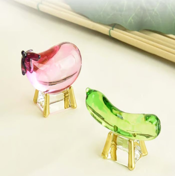 お盆の飾りである、キュウリで作る馬と、ナスで作る牛をクリスタルガラスで用意しました。