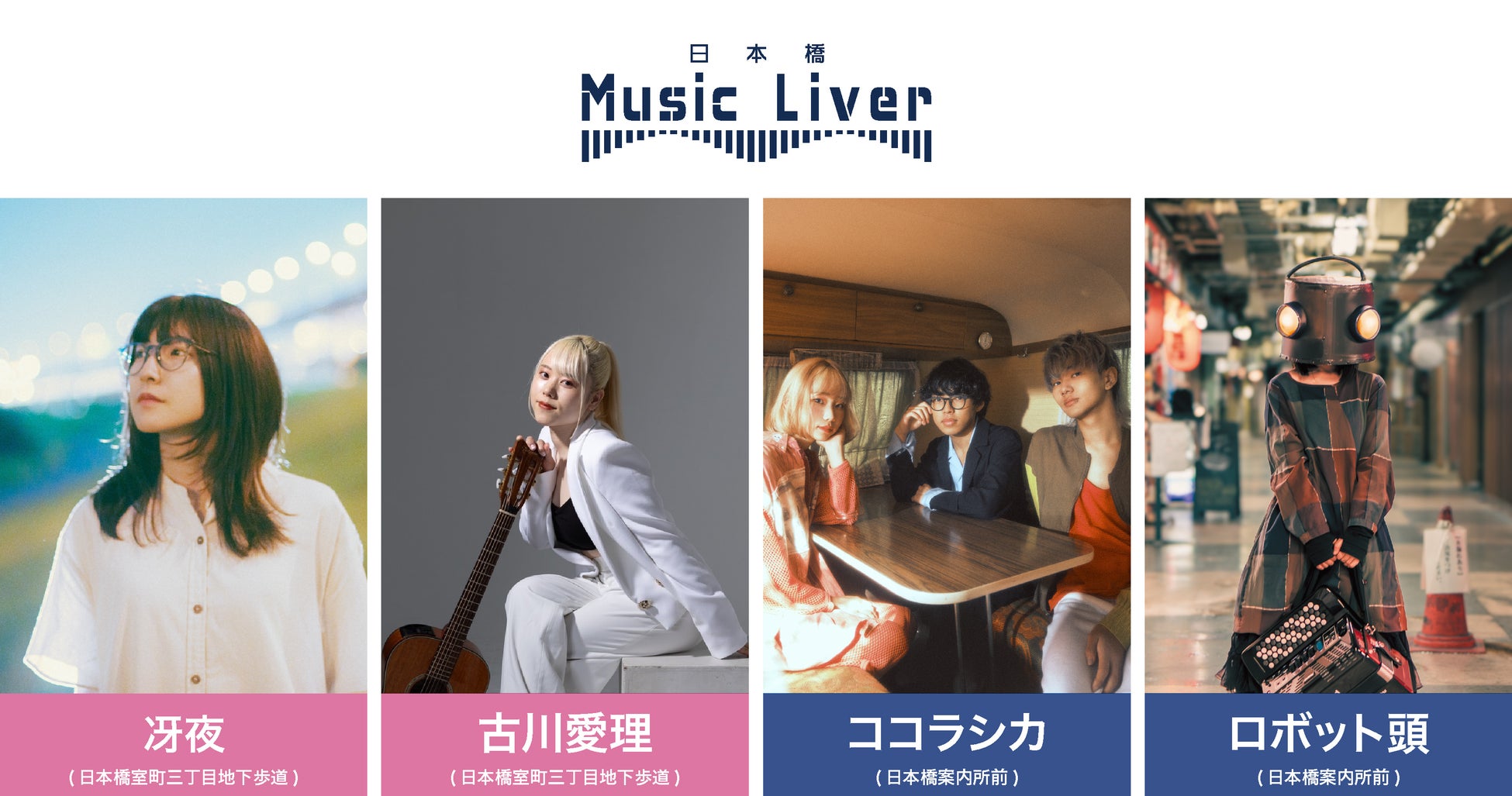 日本橋案内所前会場では、『未成年~未熟な俺たちは不器用に進行中』のエンディング主題歌を担当するなど活動の幅を広げるココラシカと、現実と空想が混ざったような不思議で独特な世界観を表現したライブパフォーマンスが魅力のロボット頭が出演いたします。