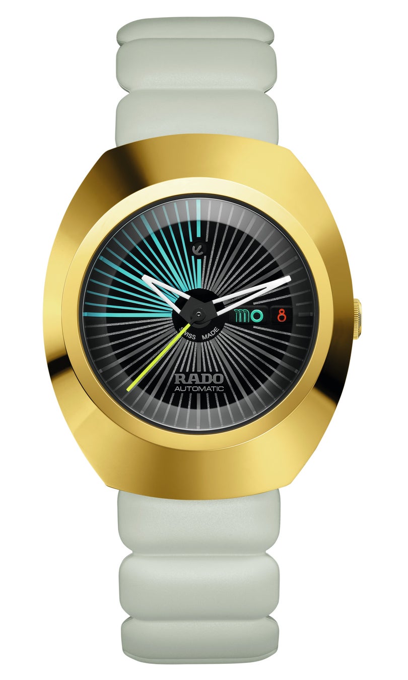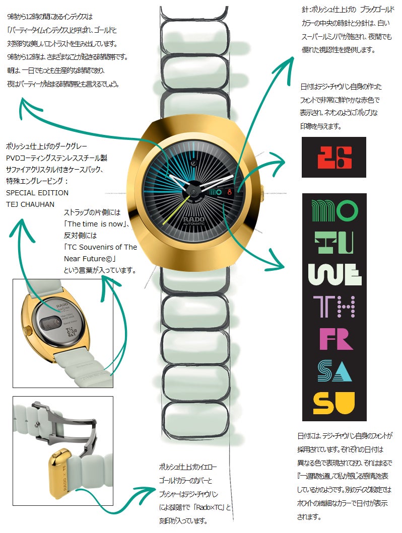 「ダイヤスター オリジナル x テジ・チャウハン」は、ラドーの名作「ダイヤスター」をテジ・チャウハンが新たに解釈したものです。彼のミニマリストでありながら洗練されたデザイン理念を踏襲しつつ、ラドーが誇る高耐久性素材や革新的なセラミック技術を巧みに組み合わせ、未来的でありながらエレガントな時計に仕上がっています。特に注目すべきは、イエローゴールドPVDコーティングされたセラモス™ベゼルと新たなラバーストラップの採用です。