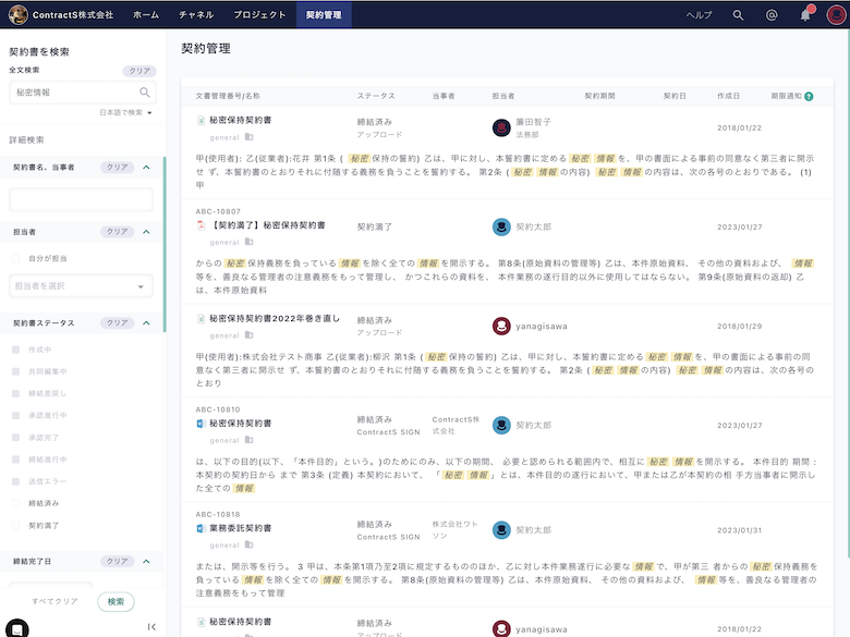 全文検索機能は、ContractS CLMに保管された多数の締結済みの契約書から、任意のキーワードが本文に含まれる契約書を検索することができる機能です。