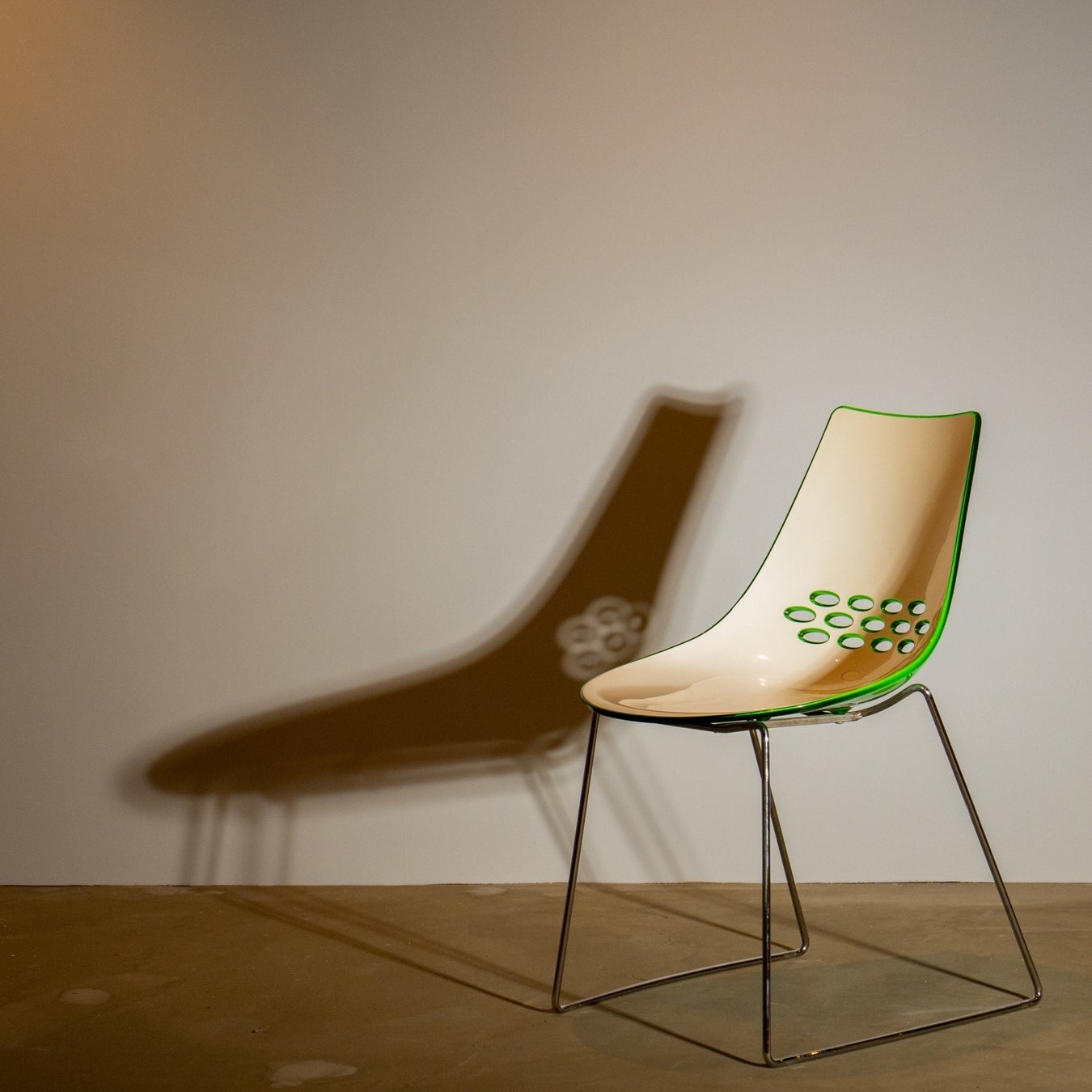 白い座面とカラフルな背面の二面性のあるデザインが印象的な、ダイニングチェア。