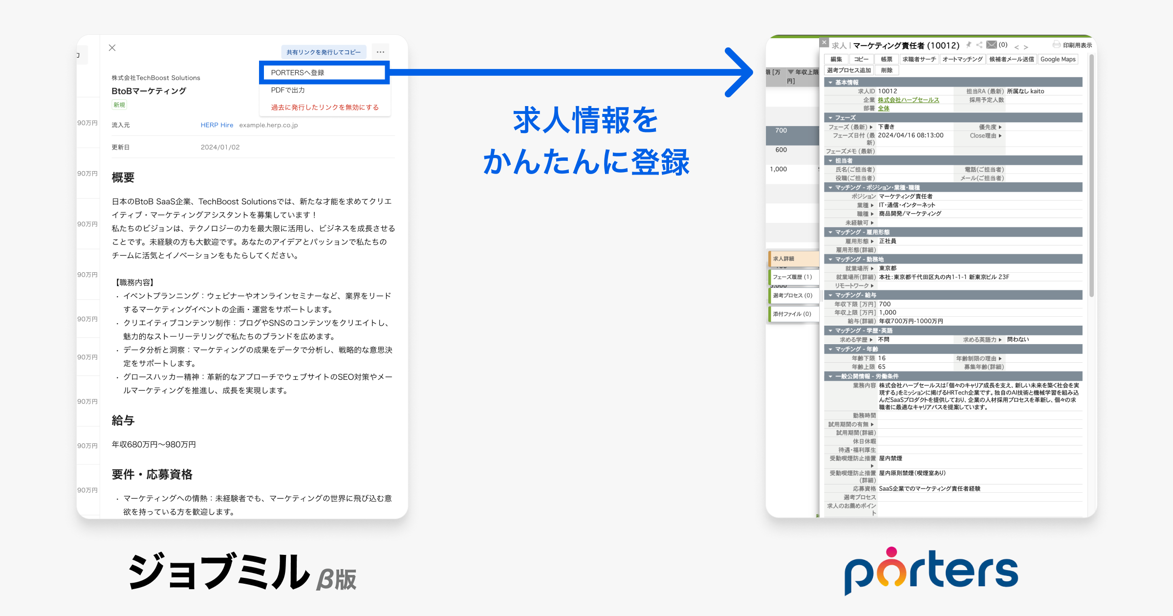 【HERP】人材紹介会社向け求人管理システム『ジョブミル』β版が、人材ビジネスのマッチングシステム『PORTERS』との機能連携を開始