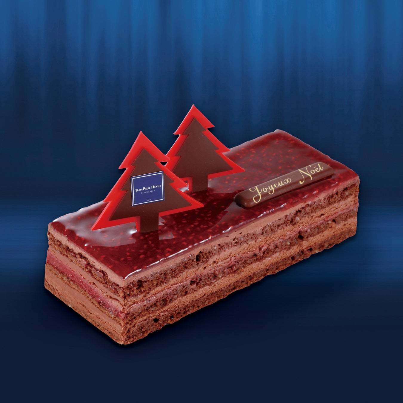カカオとアーモンドのビスキュイ、ヴェネズエラ産カカオを使用したムースに、フランボワーズのジュレを合せました。赤いツリーと艶やかなフランボワーズのコンフィチュールがクリスマスの食卓を彩ります。