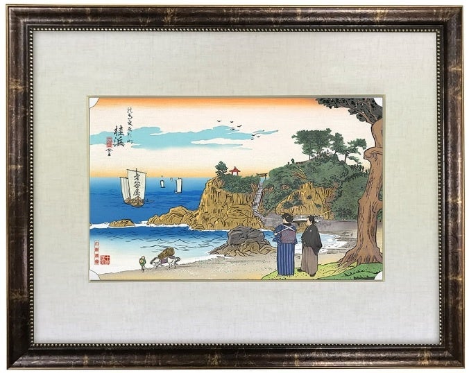 すでに第一弾「日本橋」、第二弾「品川」、第三弾「川崎」の予約受付を開始しておりますが、今作「龍馬が見た景色・桂浜」は「東海道五十三次」には登場しないものの、龍馬が郷里の土佐の中で最も愛した場所といわれる「桂浜」を題材にし「東海道五十三次」風に描いたスピンオフ作品となります。