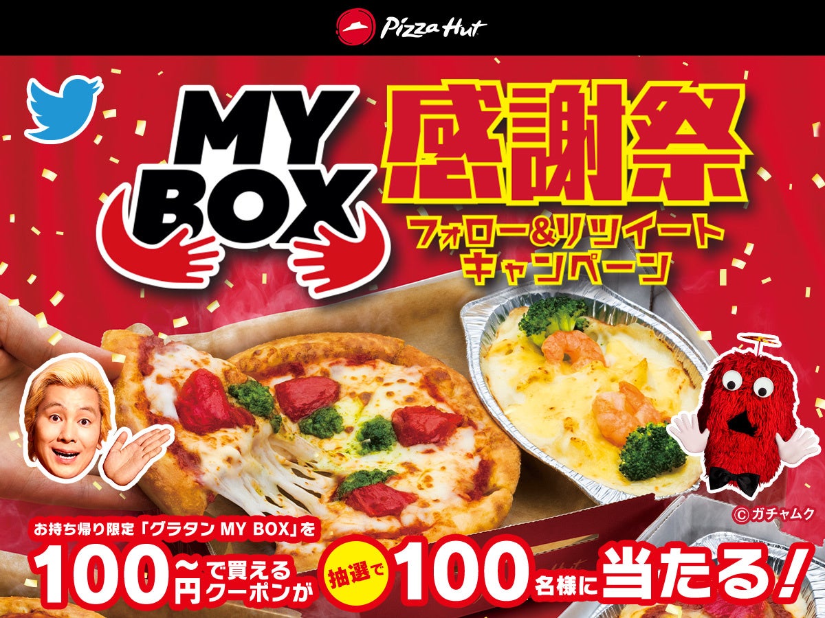 また同日よりピザハット公式Twitterにて、100通りの組み合わせができる「グラタンMY BOX※1」が100円(税込)~で買えるクーポン※2 が抽選で100名様に当たるキャンペーン『MY BOX感謝祭』を実施いたします。(Twitter:@Pizza_Hut_Japan)