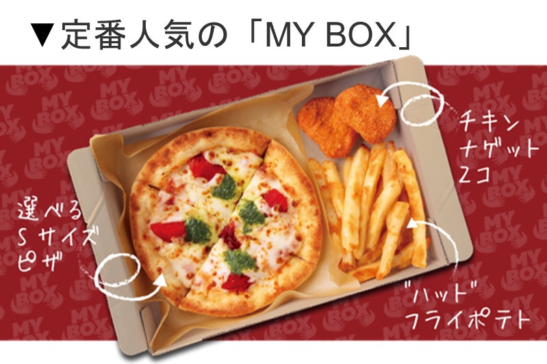昨年1月より発売開始した、おひとりさま専用のピザセット「MY BOX(マイボックス)」は、2022年1月12日(水)で全国発売1周年を迎えます。「MY BOX」はSサイズピザに、ポテトとナゲットがセットになった、おひとりさまでもお気軽にお楽しみいただける商品で、発売から1年で総販売個数180万個を突破し、多くの方に愛されています。