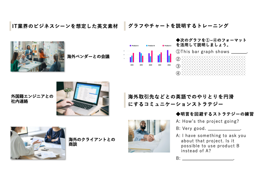 IT業界のビジネスシーンを想定した教材を用いることで、学んだ内容を日々の業務にすぐに活かすことができます。これは英語教育分野において「ESP(English for Specific Purposes)=特定目的のための英語」と呼ばれるものであり、効率的に必要かつ実践的な英語が学べるというメリットがあると考えられています。