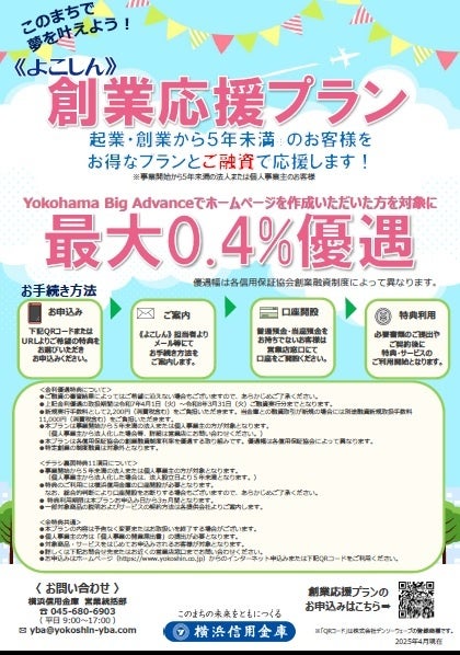 横浜信用金庫(横浜市中区 理事長 春日 隆)では、起業間もない中小企業に対する支援を強化することを目的に、最大0.4%金利優遇の取扱いを以下の通り開始します。