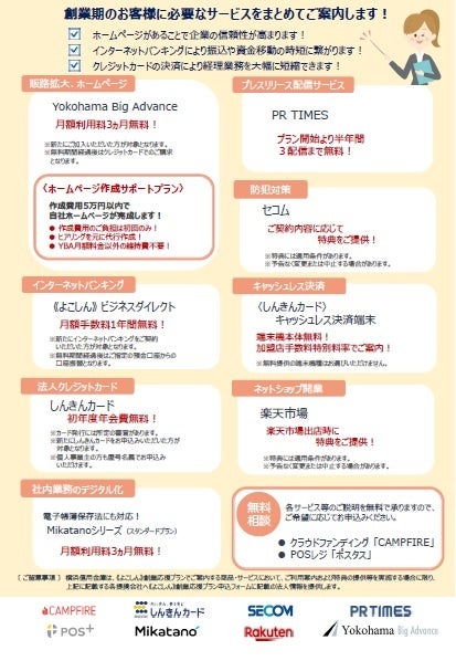 以下の①と②に該当する事業者さま ①事業開始から5年未満の法人および個人事業主 (個人事業主から法人化した場合等、詳細は個別対応となるので営業店にお問い合わせください) ②経営支援プラットフォームYokohama Big Advance(以下「YBA」といいます)においてホームページを作成いただいた方 |
