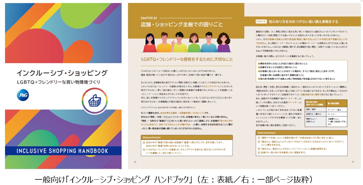 P&Gとウエルシアは、2022年の夏より「インクルーシブ・ショッピング プロジェクト」の本格始動に向けた取り組みを進めてまいりました。その一環として、自分らしく働ける職場の創造を手掛ける、株式会社JobRainbow(以下、JobRainbow)と協力し、性のあり方に関わらずLGBTQ+のお客様が安心して買い物をしていただけるよう、接客時の注意点をまとめた「インクルーシブ・ショッピング ハンドブック」の開発を共同で行いました。
